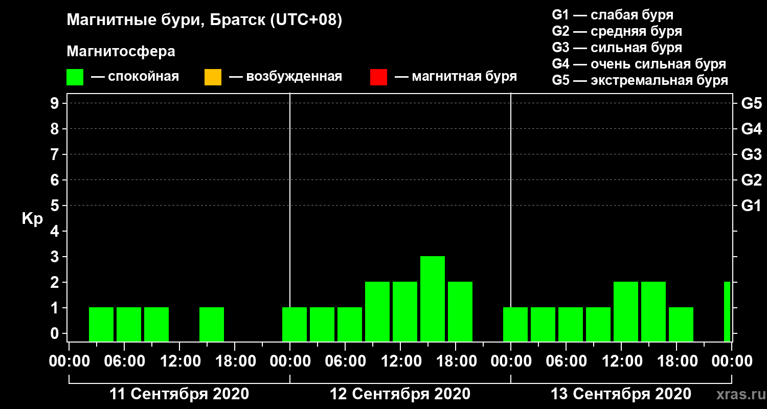 Изменения геомагнитного индекса Kp с 11 по 13 сентября 2020 года для средних широт