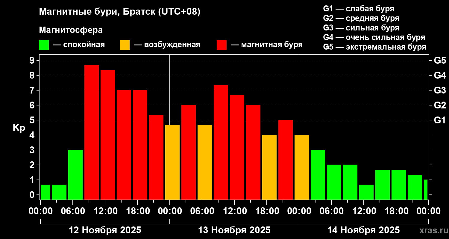 Изменения геомагнитного индекса Kp с 12 по 14 ноября 2025 года для средних широт