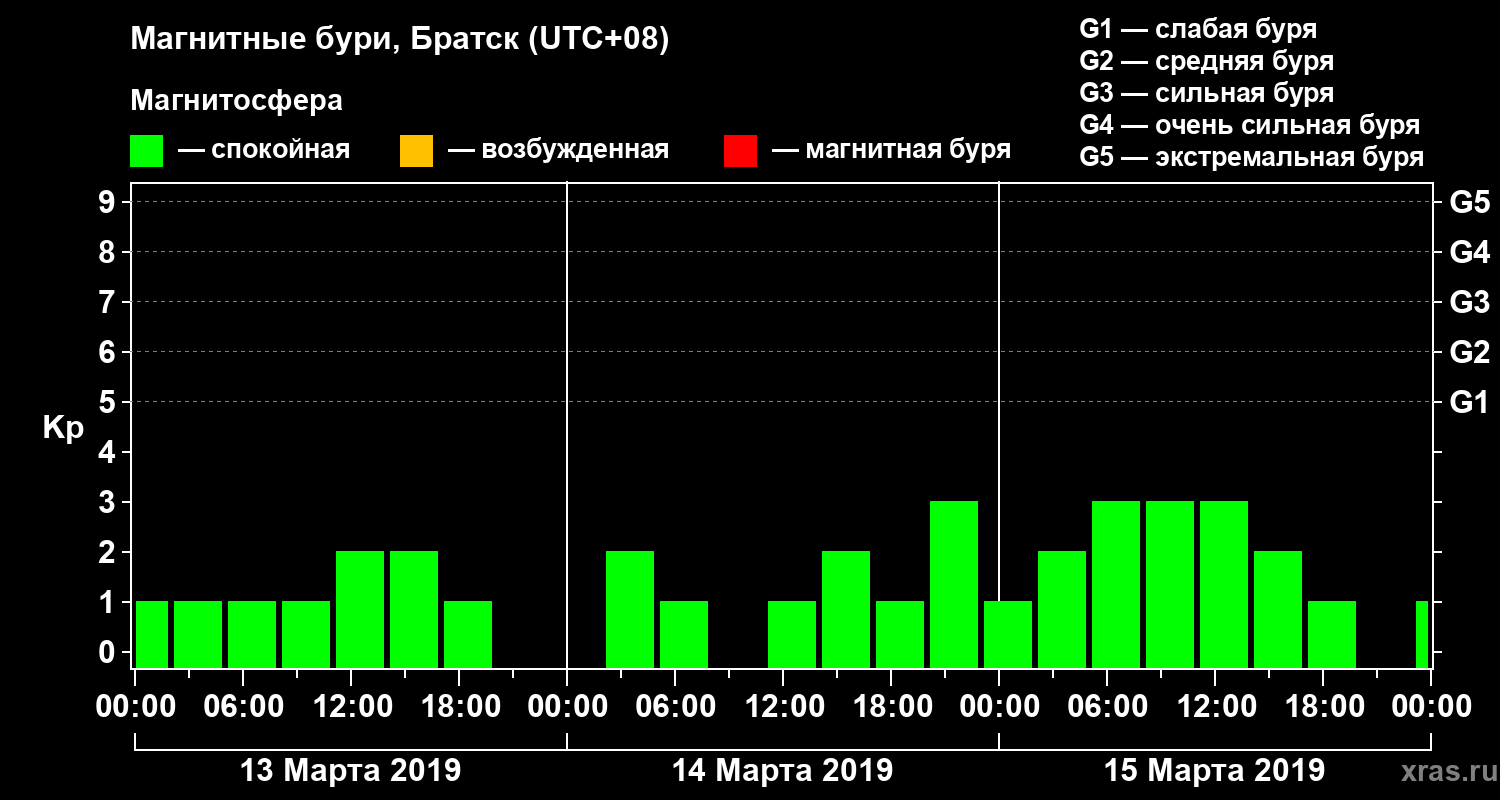 Изменения геомагнитного индекса Kp с 13 по 15 марта 2019 года для средних широт