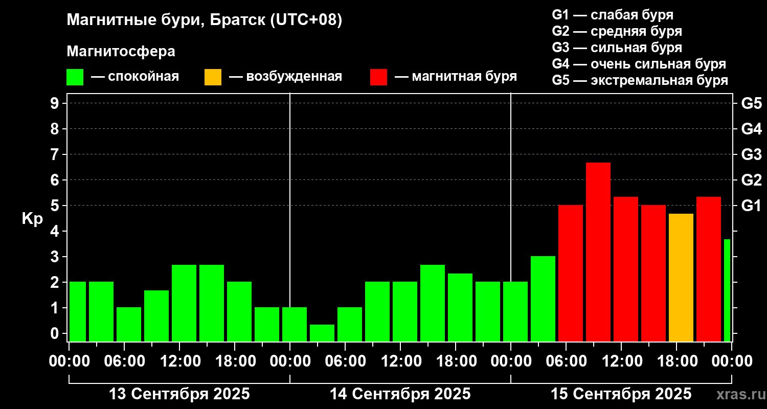 Изменения геомагнитного индекса Kp с 13 по 15 сентября 2025 года для средних широт