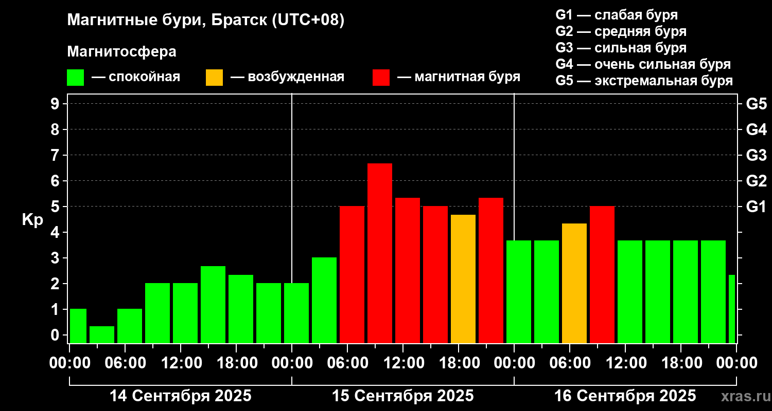 Изменения геомагнитного индекса Kp с 14 по 16 сентября 2025 года для средних широт