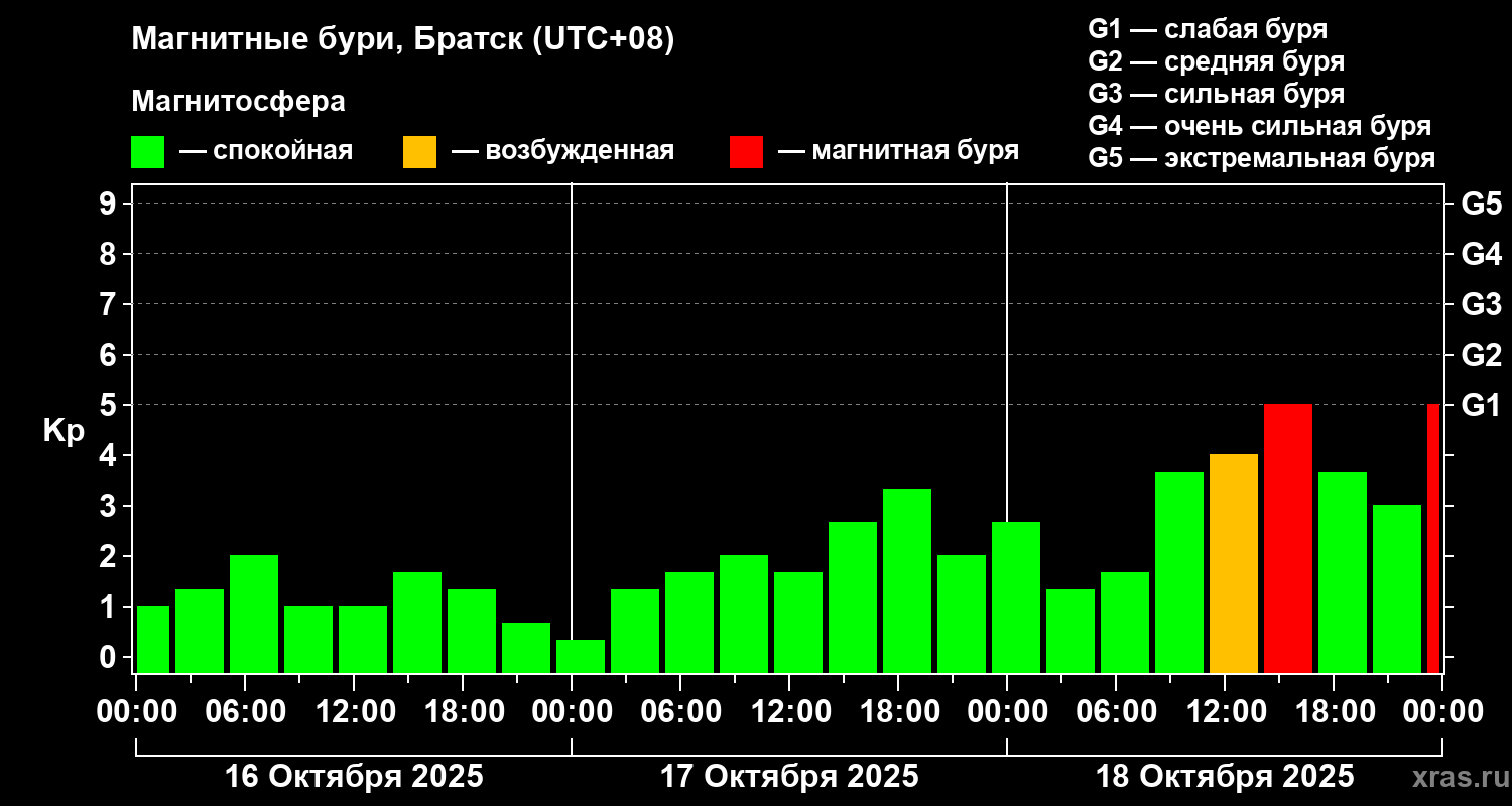 Изменения геомагнитного индекса Kp с 16 по 18 октября 2025 года для средних широт