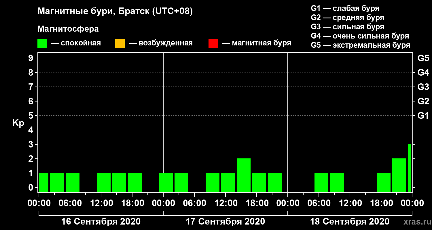 Изменения геомагнитного индекса Kp с 16 по 18 сентября 2020 года для средних широт