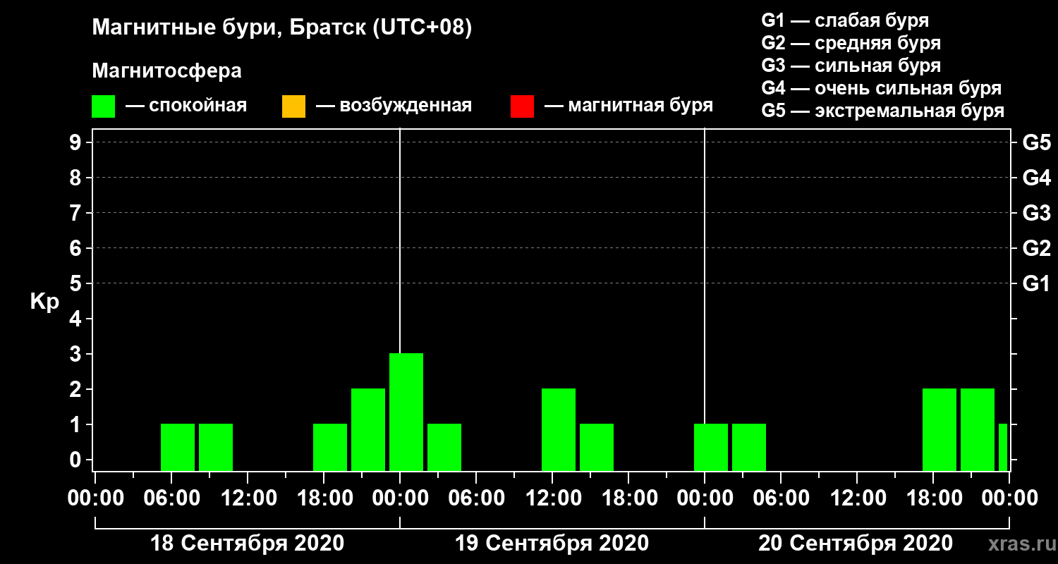Изменения геомагнитного индекса Kp с 18 по 20 сентября 2020 года для средних широт
