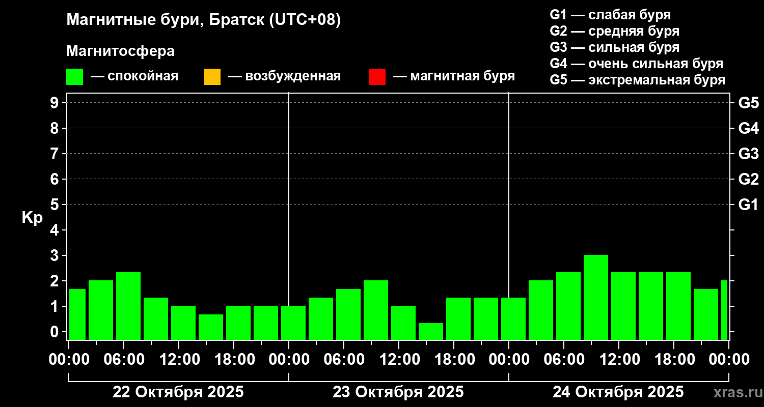 Изменения геомагнитного индекса Kp с 22 по 24 октября 2025 года для средних широт