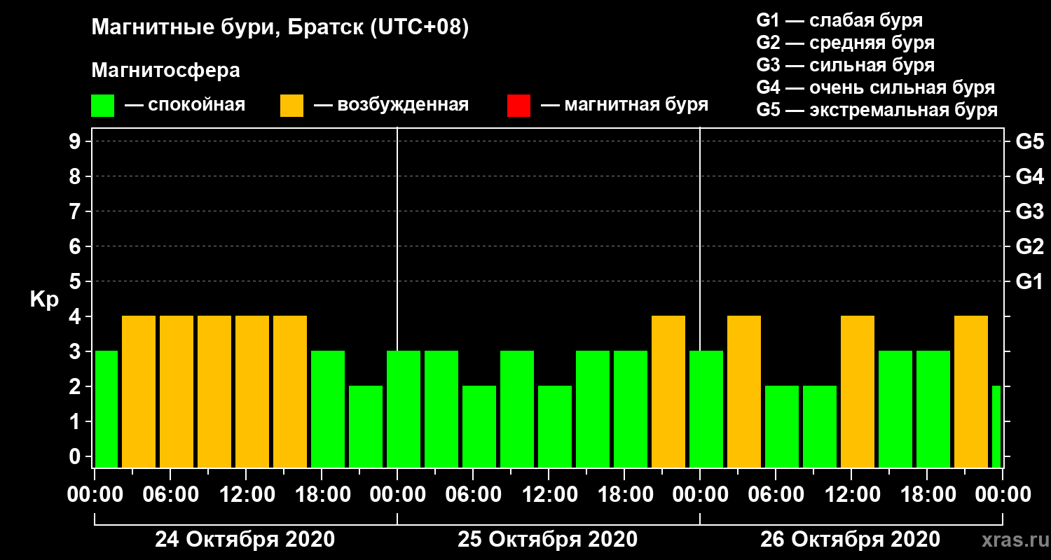 Изменения геомагнитного индекса Kp с 24 по 26 октября 2020 года для средних широт
