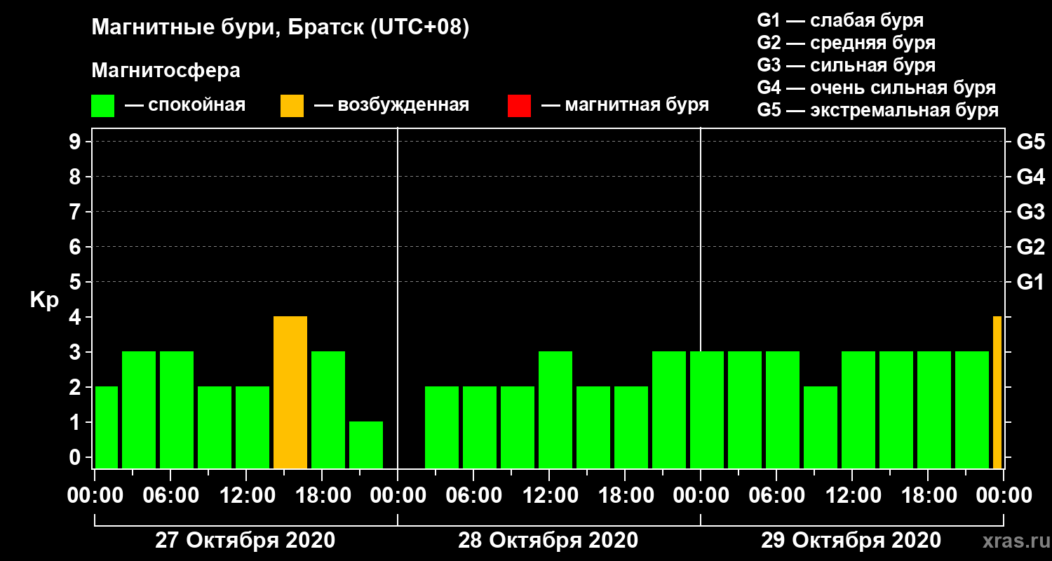 Изменения геомагнитного индекса Kp с 27 по 29 октября 2020 года для средних широт