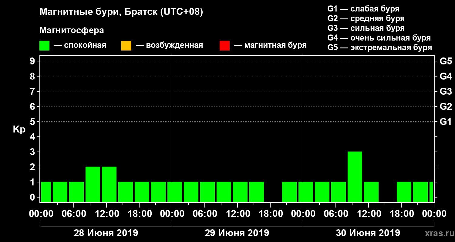 Изменения геомагнитного индекса Kp с 28 по 30 июня 2019 года для средних широт