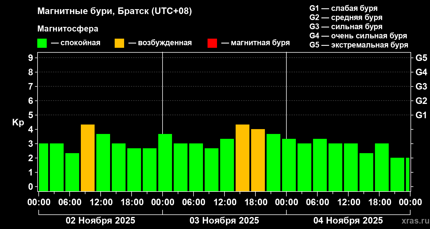 Изменения геомагнитного индекса Kp с 2 по 4 ноября 2025 года для средних широт