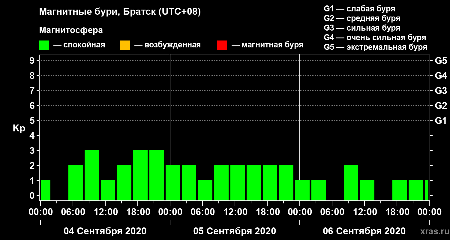Изменения геомагнитного индекса Kp с 4 по 6 сентября 2020 года для средних широт