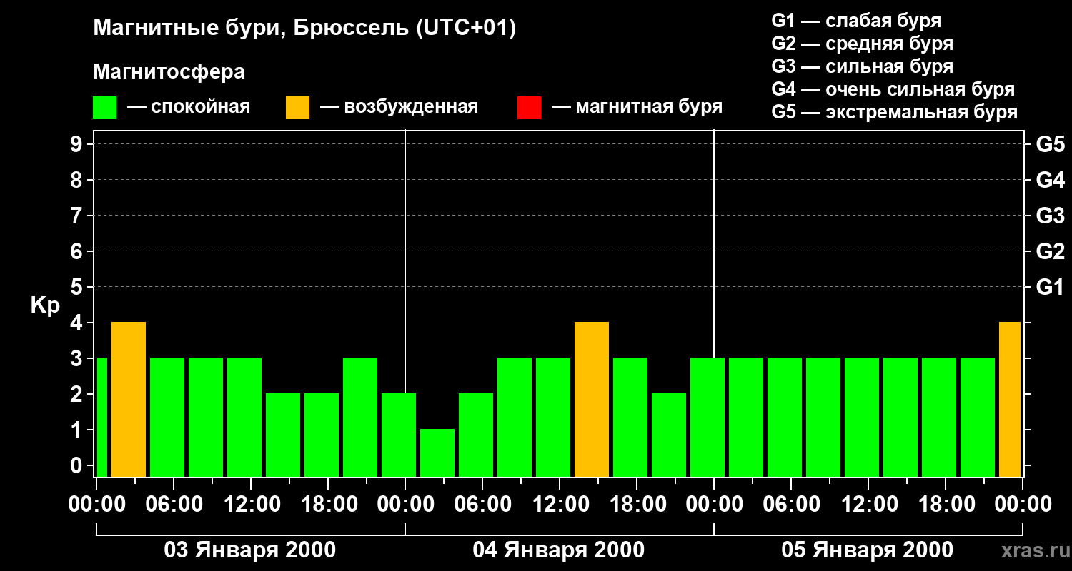 Изменения геомагнитного индекса Kp с 3 по 5 января 2000 года для средних широт
