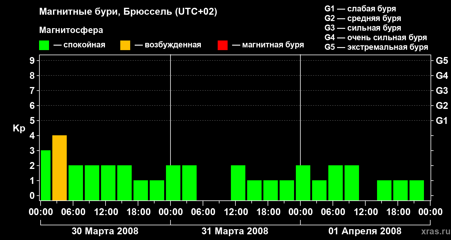 Изменения геомагнитного индекса Kp с 30 марта по 1 апреля 2008 года для средних широт