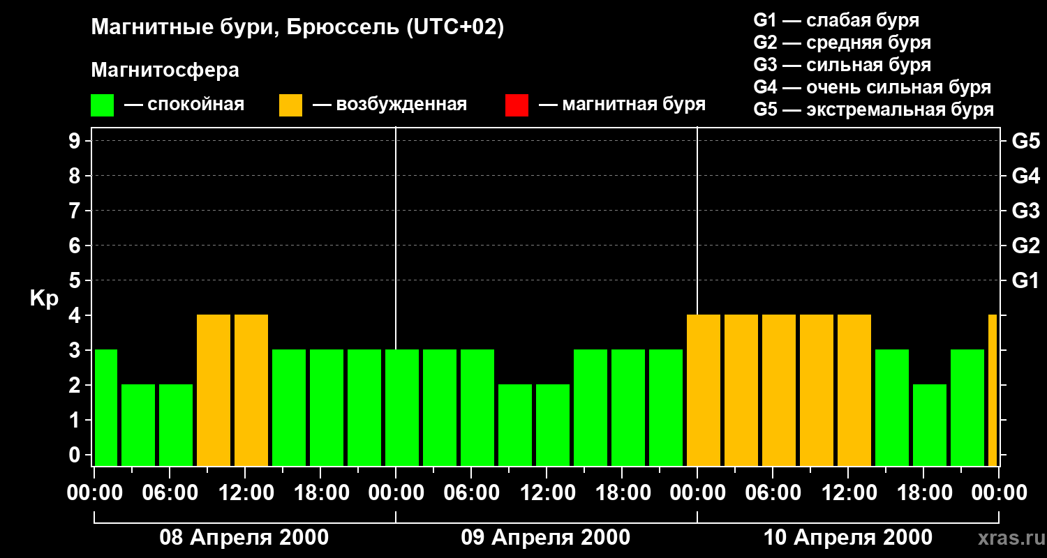 Изменения геомагнитного индекса Kp с 8 по 10 апреля 2000 года для средних широт