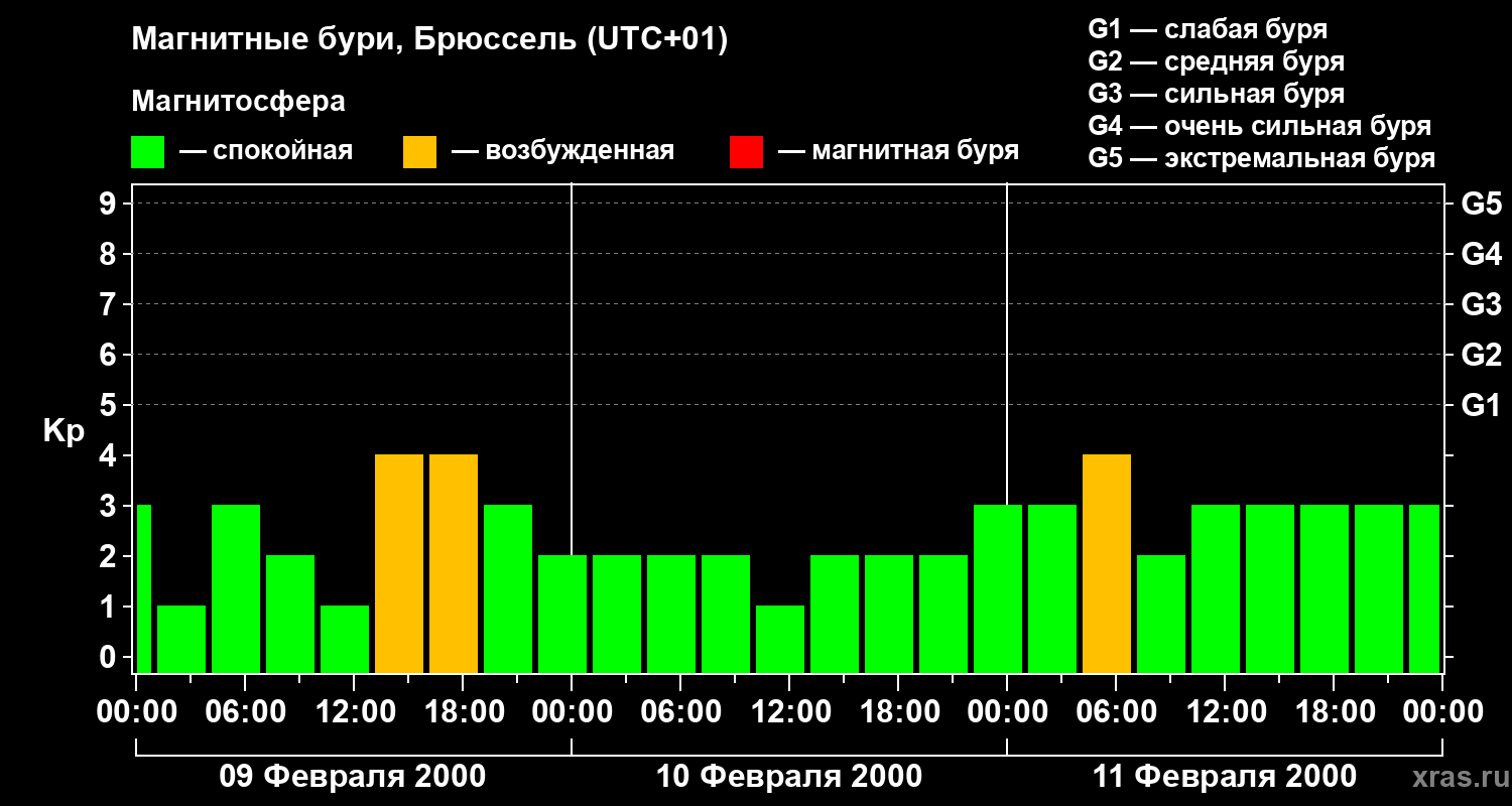 Изменения геомагнитного индекса Kp с 9 по 11 февраля 2000 года для средних широт