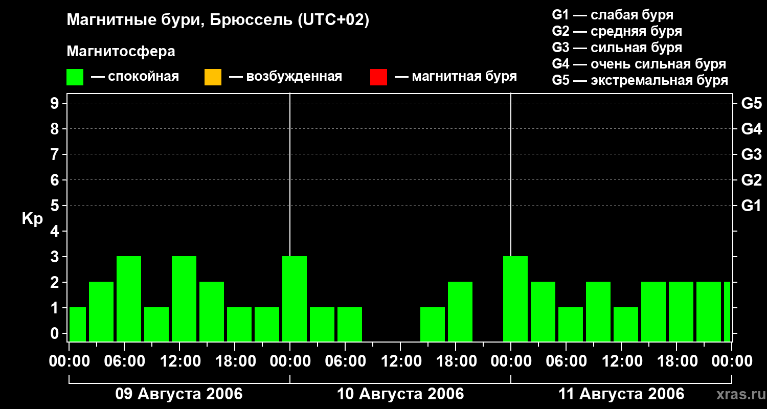Изменения геомагнитного индекса Kp с 9 по 11 августа 2006 года для средних широт
