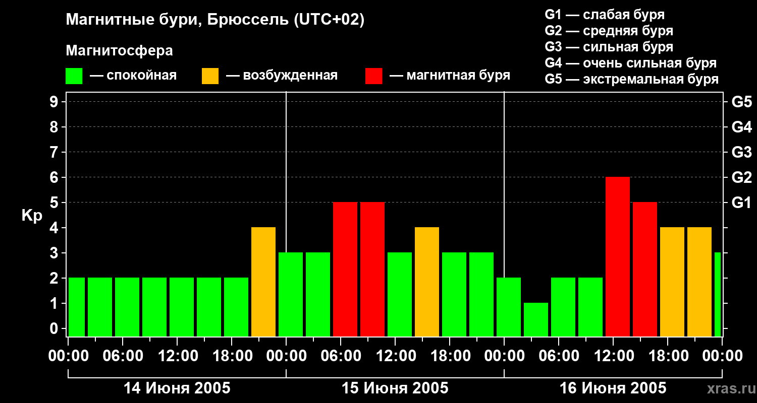 Изменения геомагнитного индекса Kp с 14 по 16 июня 2005 года для средних широт