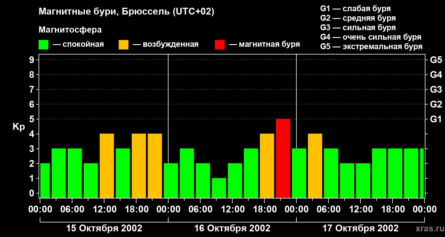 Изменения геомагнитного индекса Kp с 15 по 17 октября 2002 года для средних широт