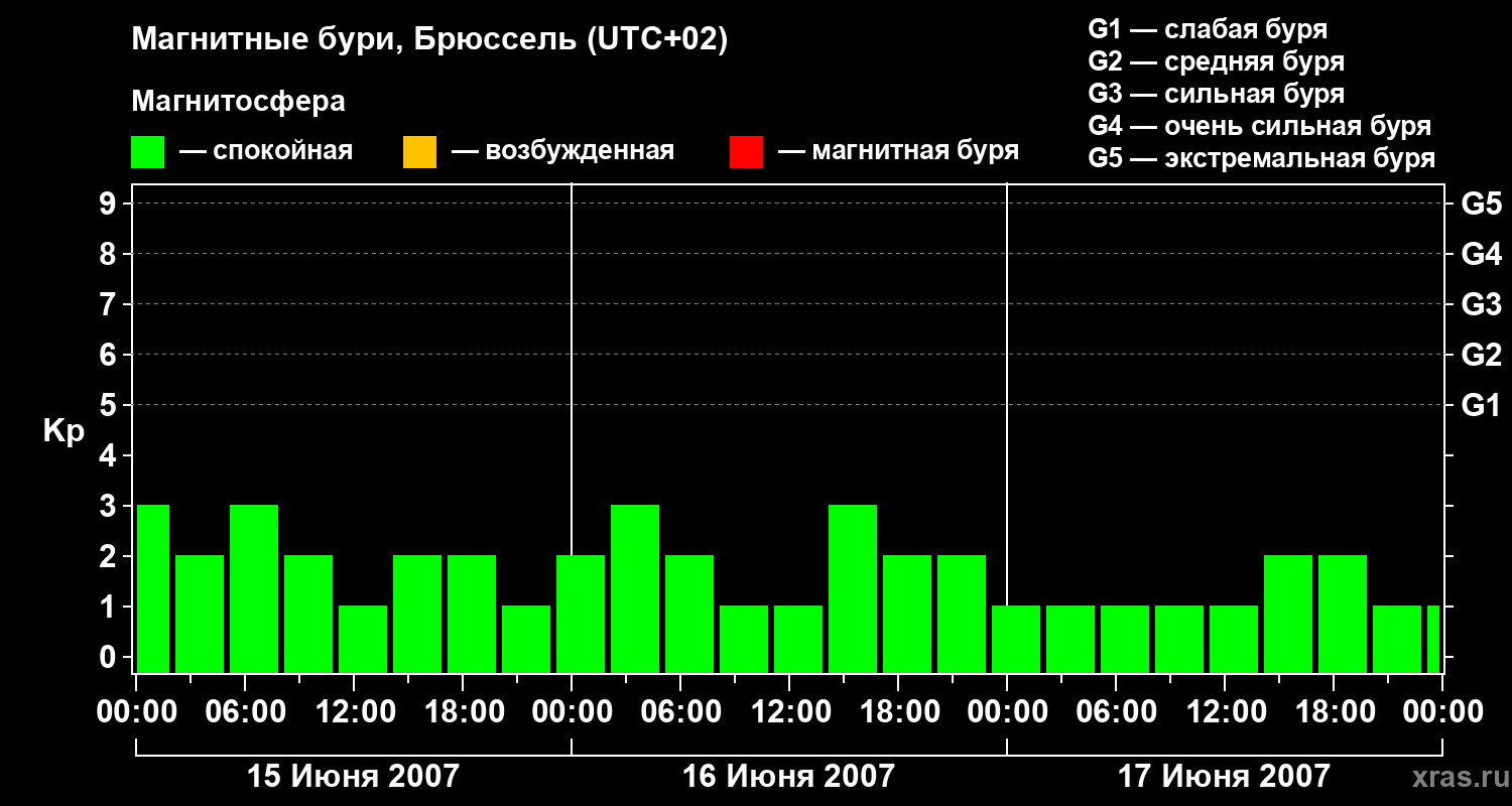 Изменения геомагнитного индекса Kp с 15 по 17 июня 2007 года для средних широт