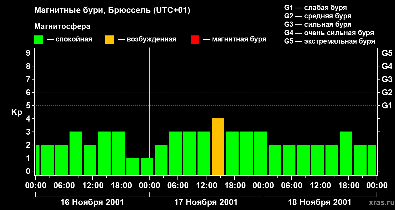Изменения геомагнитного индекса Kp с 16 по 18 ноября 2001 года для средних широт