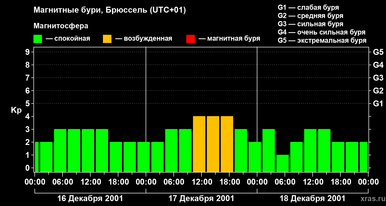 Изменения геомагнитного индекса Kp с 16 по 18 декабря 2001 года для средних широт