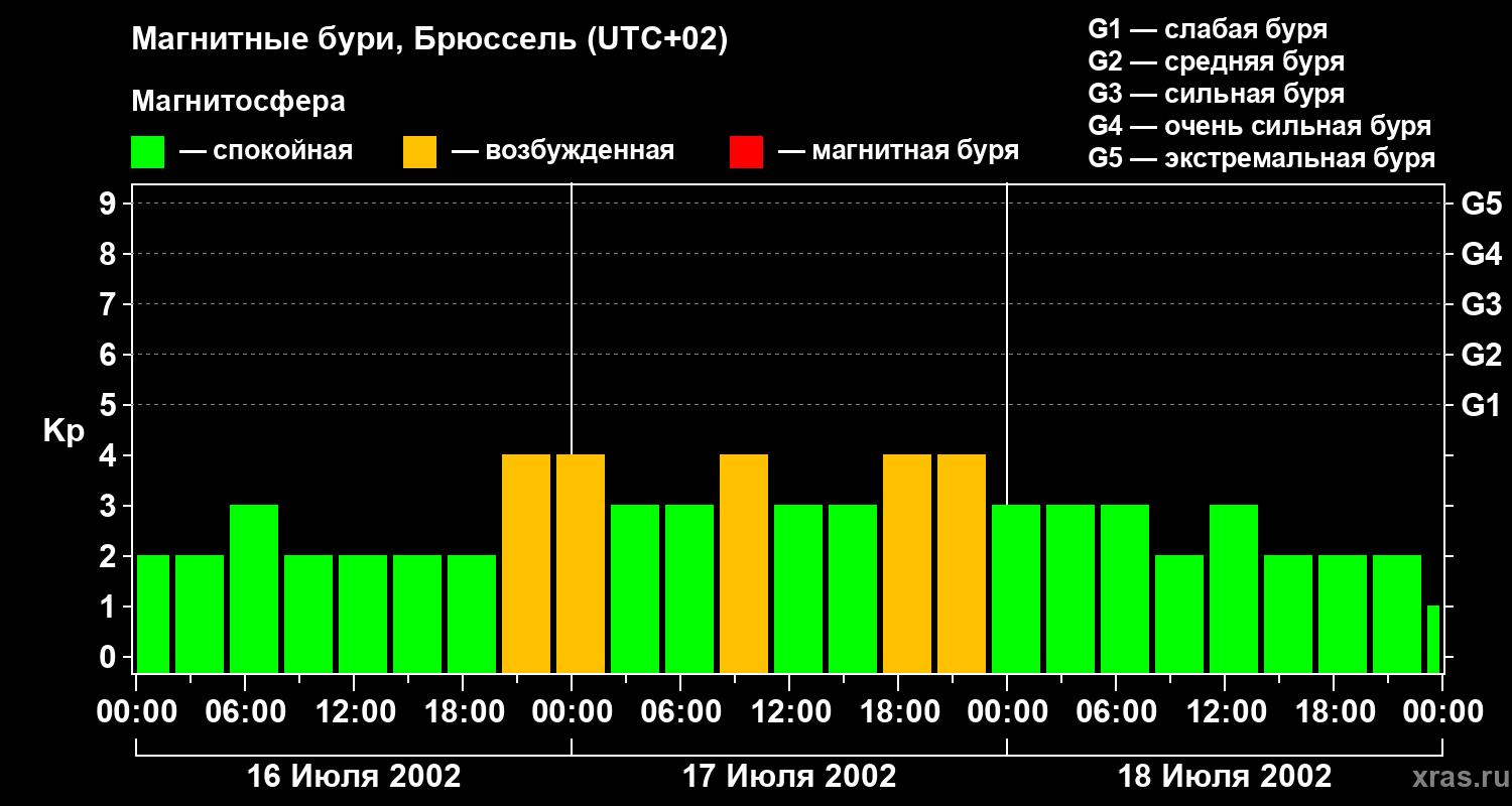 Изменения геомагнитного индекса Kp с 16 по 18 июля 2002 года для средних широт