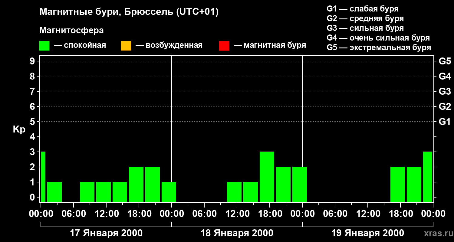 Изменения геомагнитного индекса Kp с 17 по 19 января 2000 года для средних широт