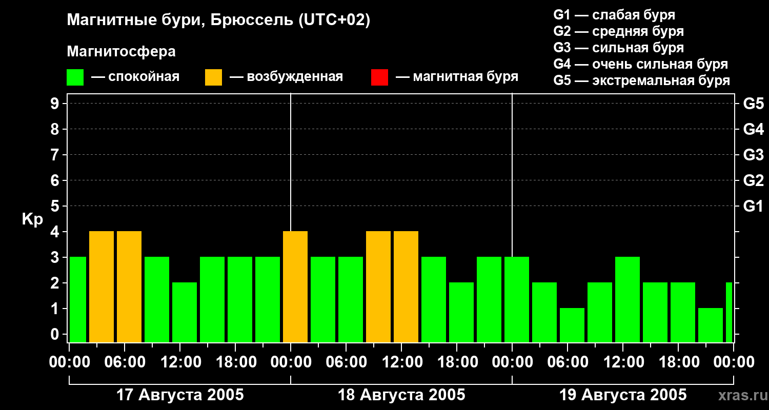 Изменения геомагнитного индекса Kp с 17 по 19 августа 2005 года для средних широт