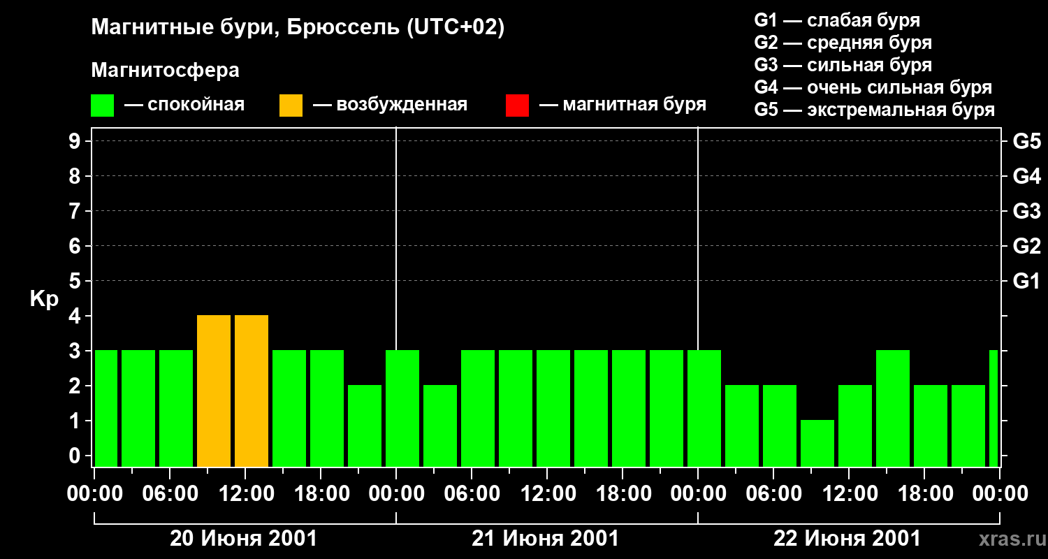 Изменения геомагнитного индекса Kp с 20 по 22 июня 2001 года для средних широт
