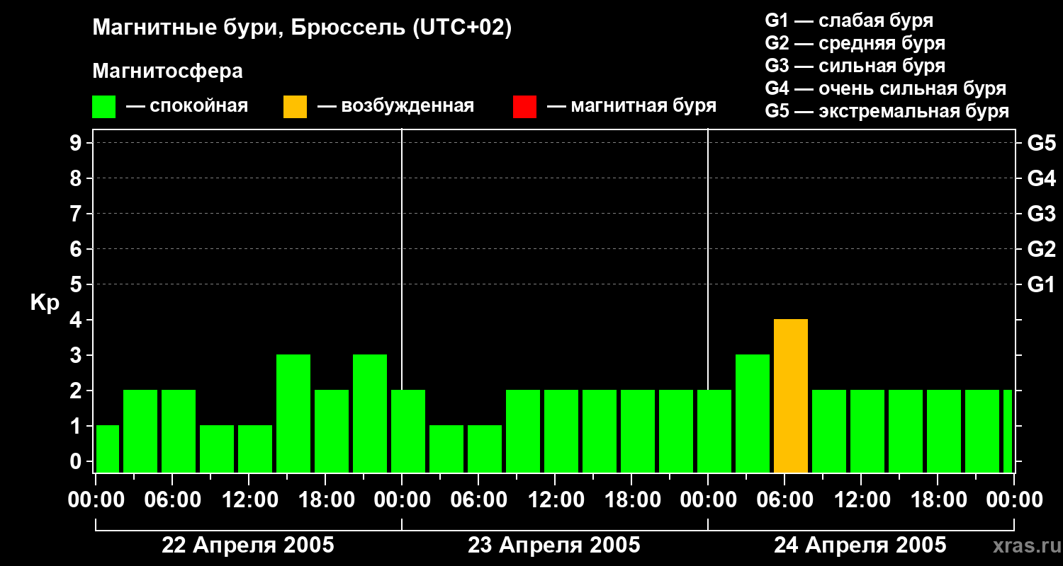 Изменения геомагнитного индекса Kp с 22 по 24 апреля 2005 года для средних широт