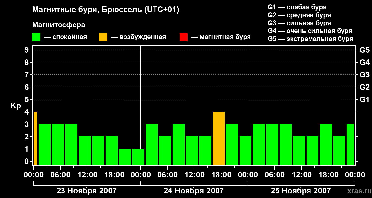 Изменения геомагнитного индекса Kp с 23 по 25 ноября 2007 года для средних широт