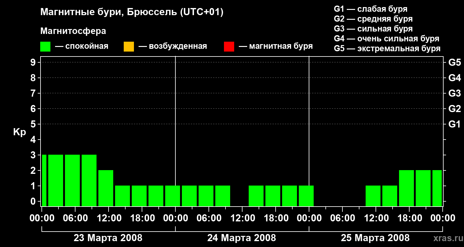 Изменения геомагнитного индекса Kp с 23 по 25 марта 2008 года для средних широт