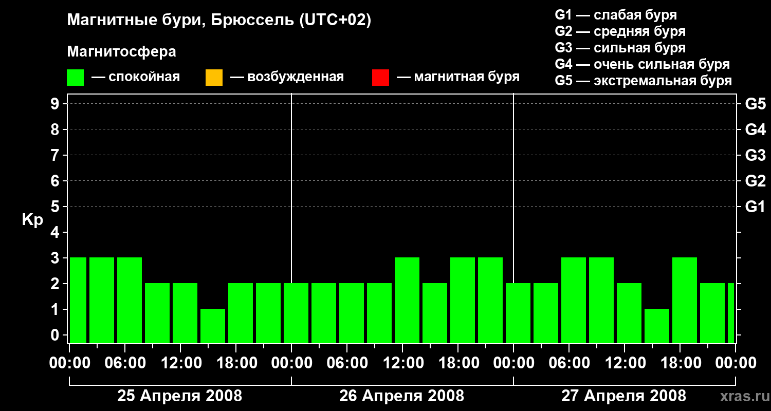 Изменения геомагнитного индекса Kp с 25 по 27 апреля 2008 года для средних широт