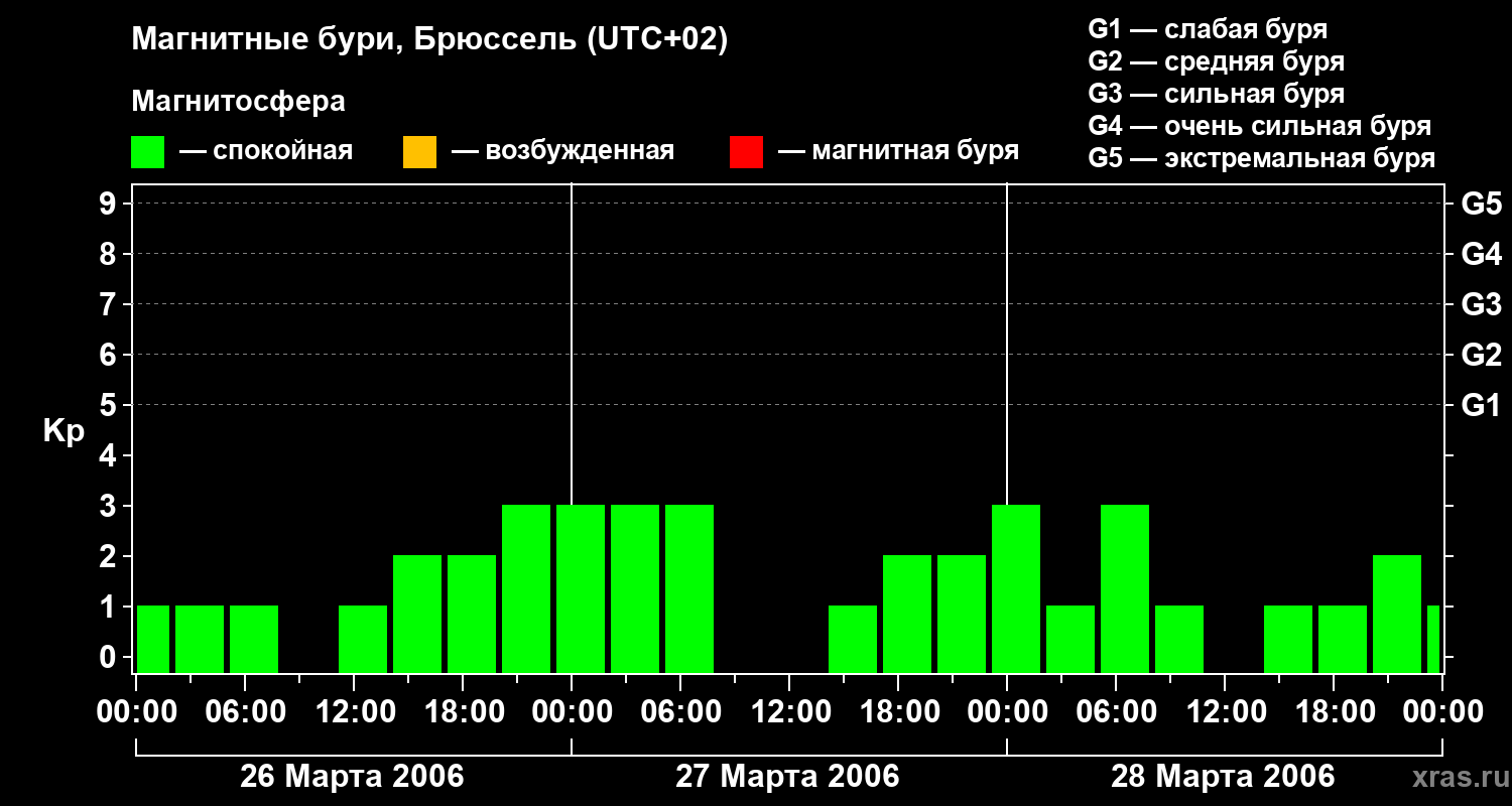 Изменения геомагнитного индекса Kp с 26 по 28 марта 2006 года для средних широт