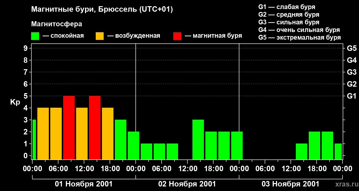 Изменения геомагнитного индекса Kp с 1 по 3 ноября 2001 года для средних широт