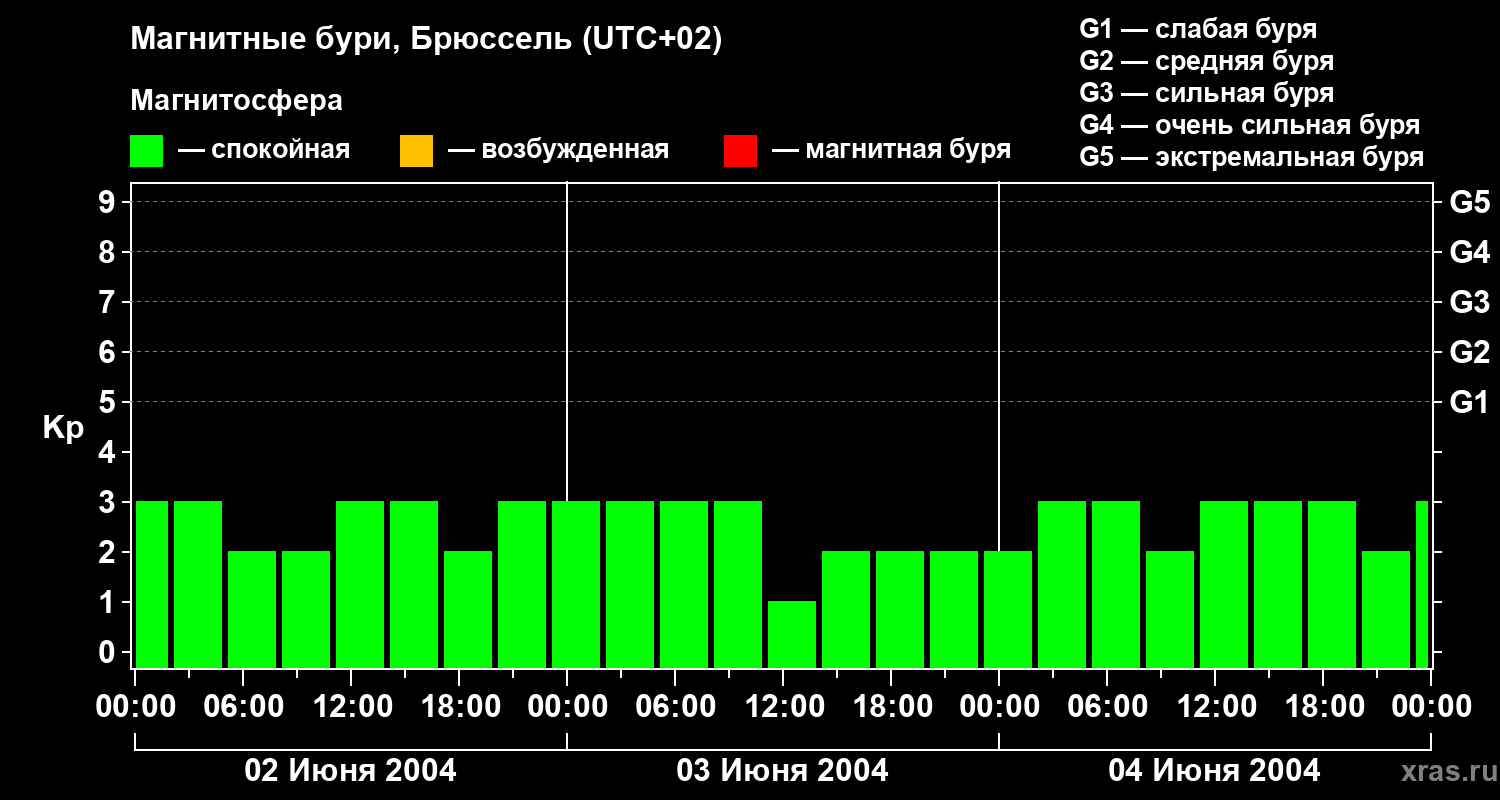 Изменения геомагнитного индекса Kp с 2 по 4 июня 2004 года для средних широт