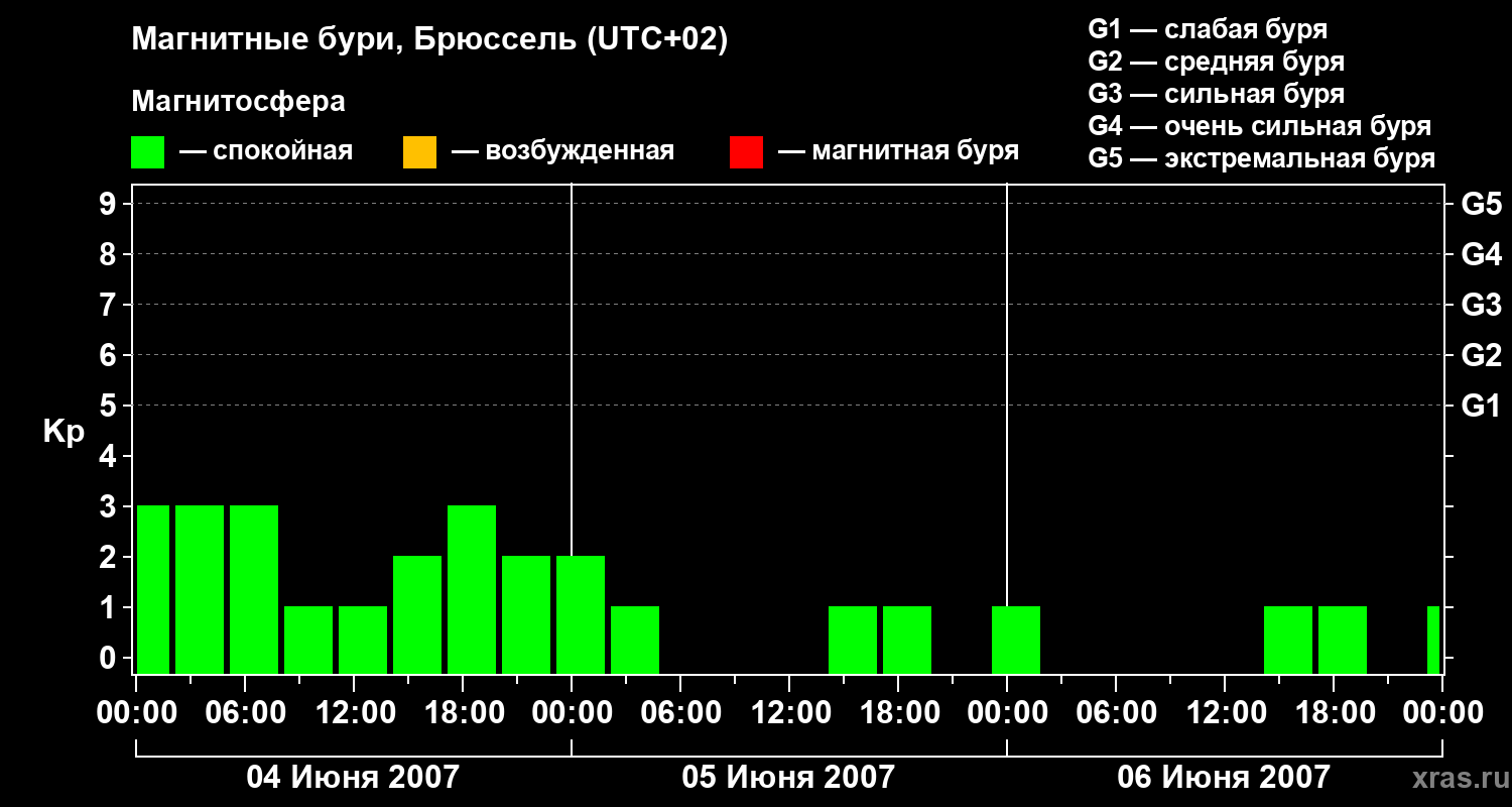 Изменения геомагнитного индекса Kp с 4 по 6 июня 2007 года для средних широт