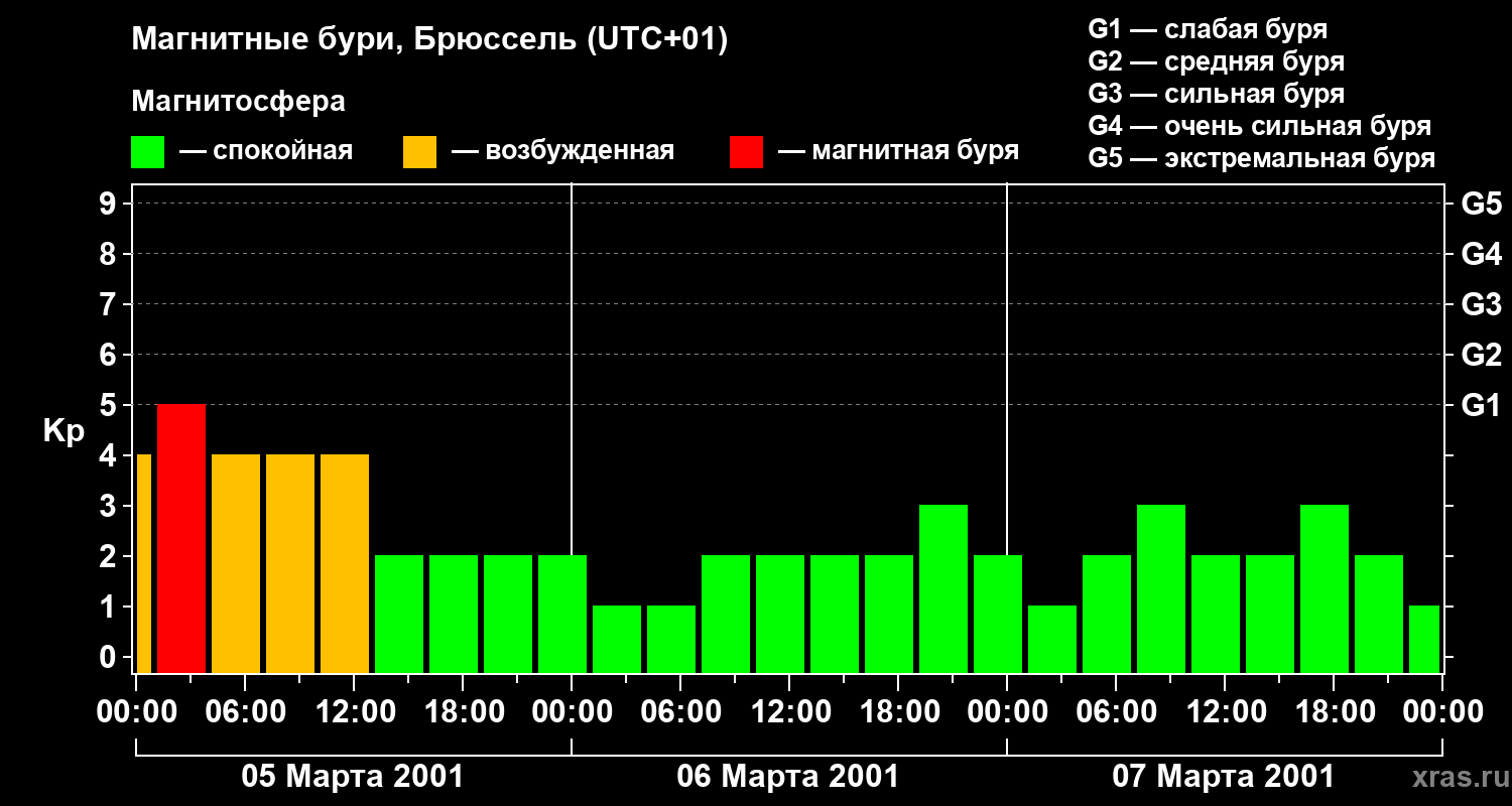 Изменения геомагнитного индекса Kp с 5 по 7 марта 2001 года для средних широт