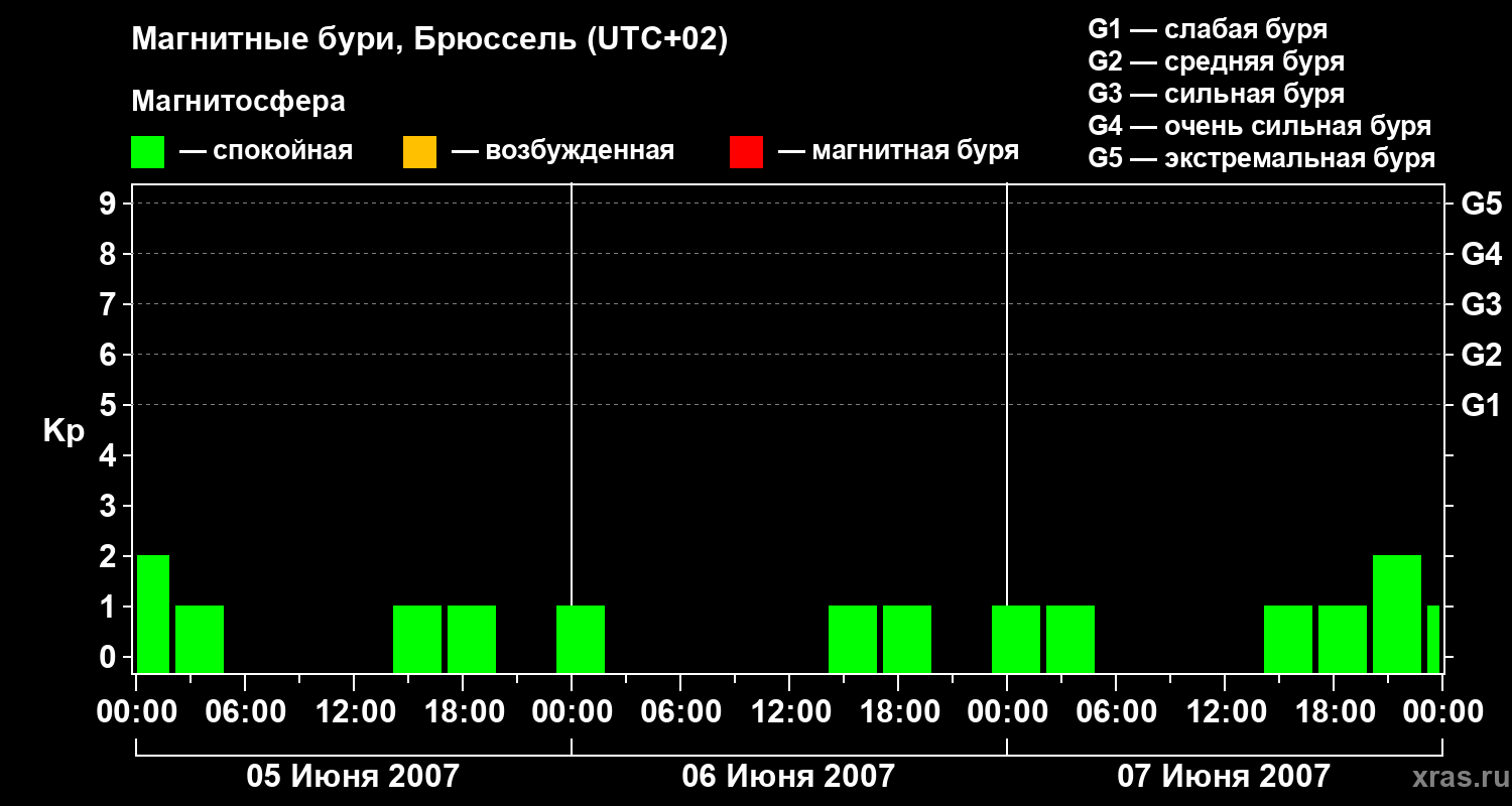 Изменения геомагнитного индекса Kp с 5 по 7 июня 2007 года для средних широт