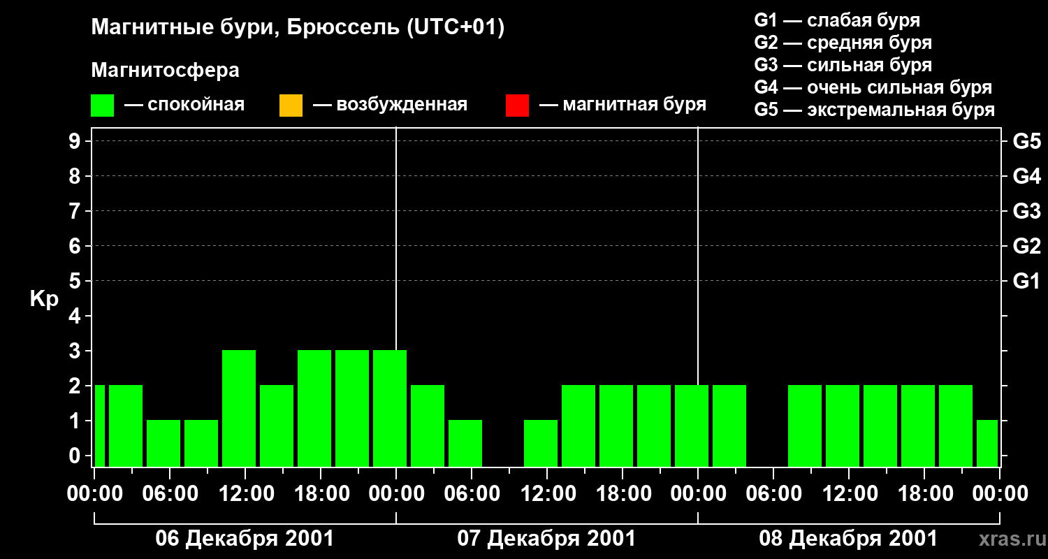 Изменения геомагнитного индекса Kp с 6 по 8 декабря 2001 года для средних широт