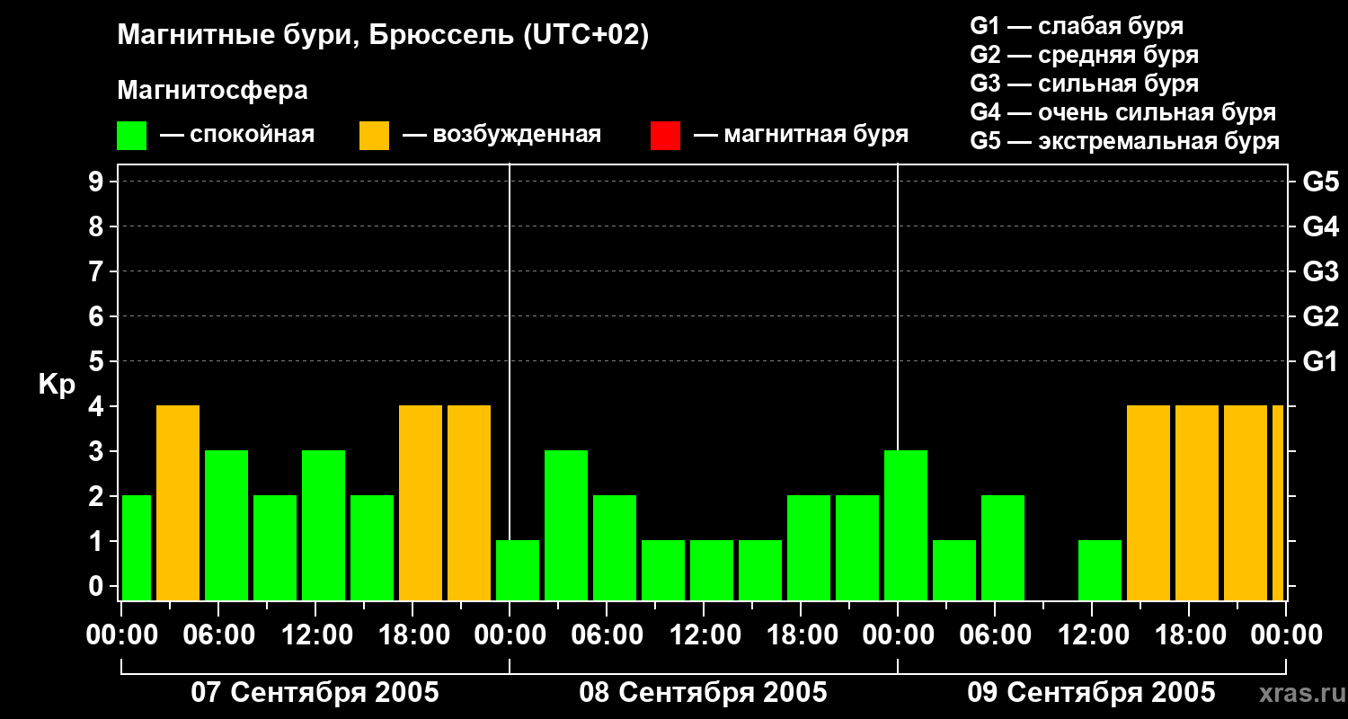 Изменения геомагнитного индекса Kp с 7 по 9 сентября 2005 года для средних широт