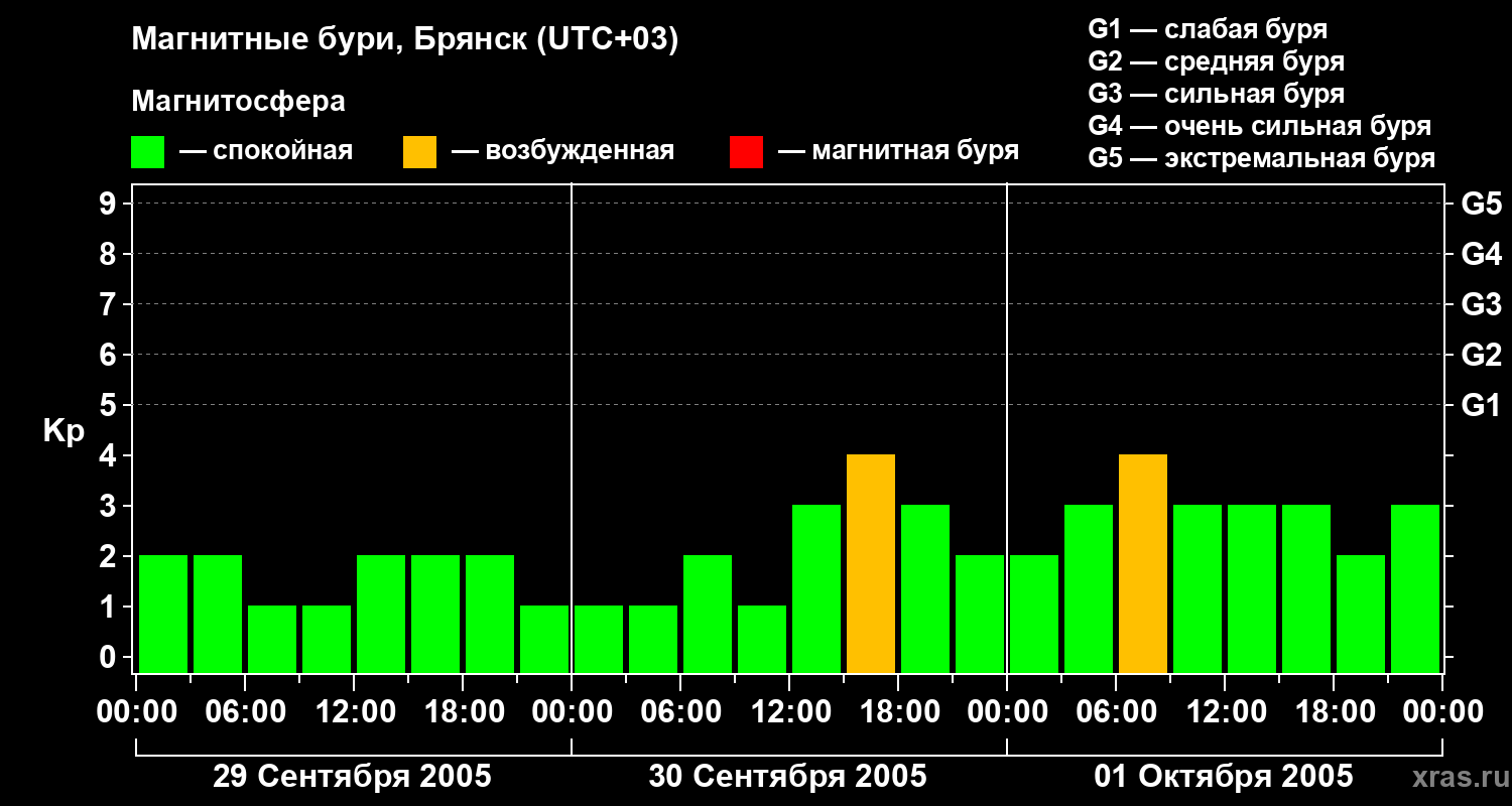 Изменения геомагнитного индекса Kp с 29 сентября по 1 октября 2005 года для средних широт