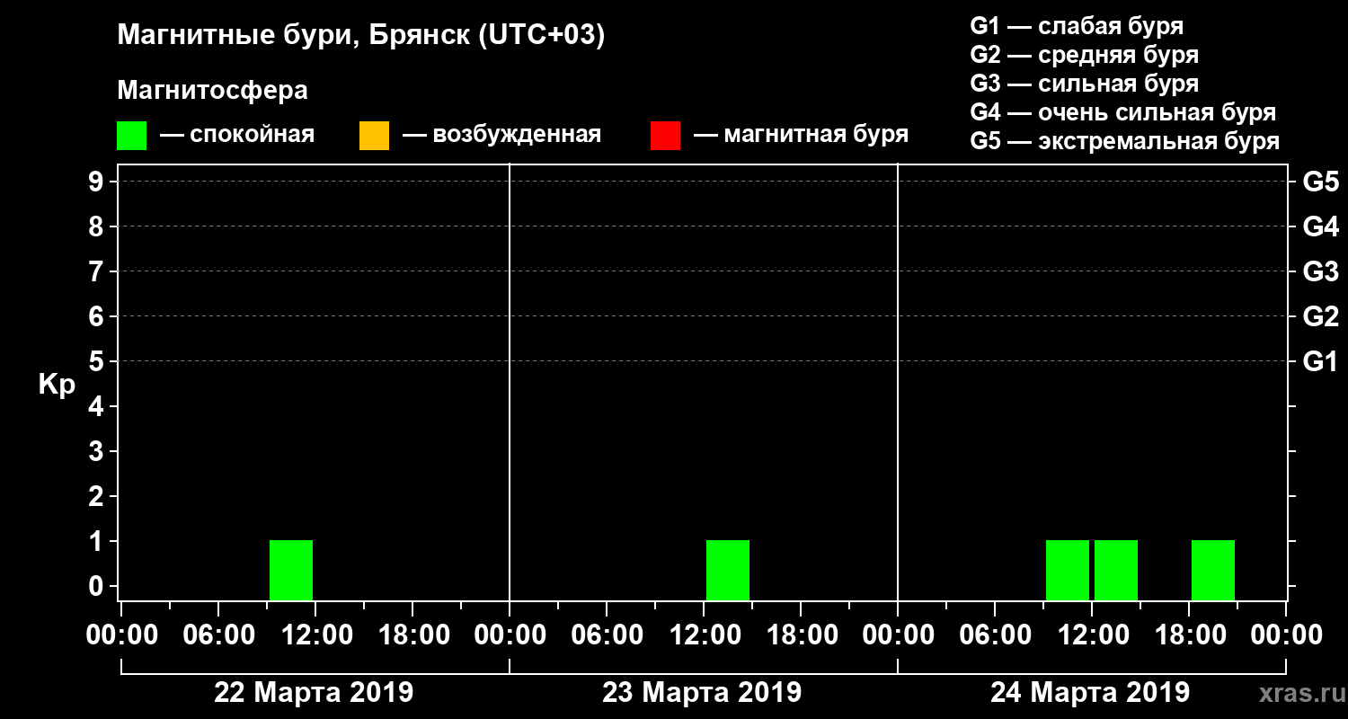 Изменения геомагнитного индекса Kp с 22 по 24 марта 2019 года для средних широт