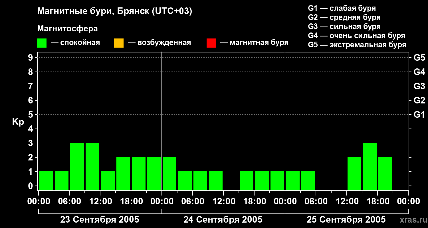 Изменения геомагнитного индекса Kp с 23 по 25 сентября 2005 года для средних широт