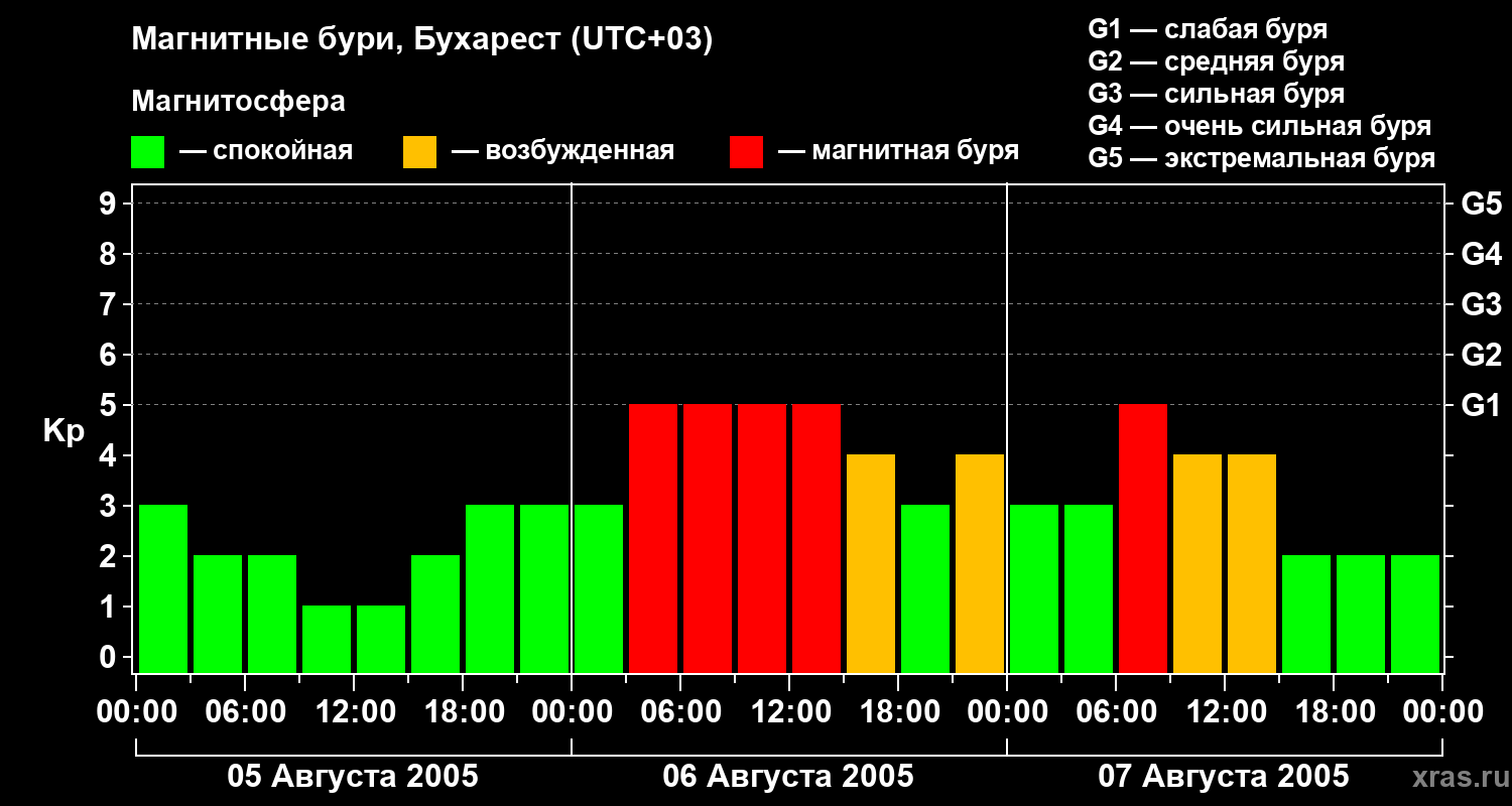 Изменения геомагнитного индекса Kp с 5 по 7 августа 2005 года для средних широт