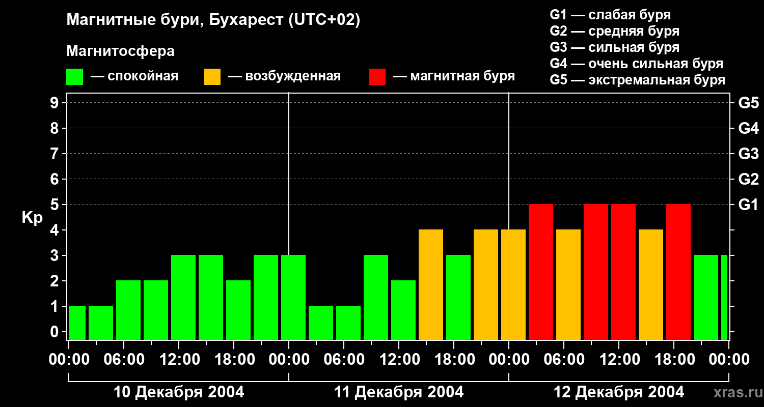 Изменения геомагнитного индекса Kp с 10 по 12 декабря 2004 года для средних широт