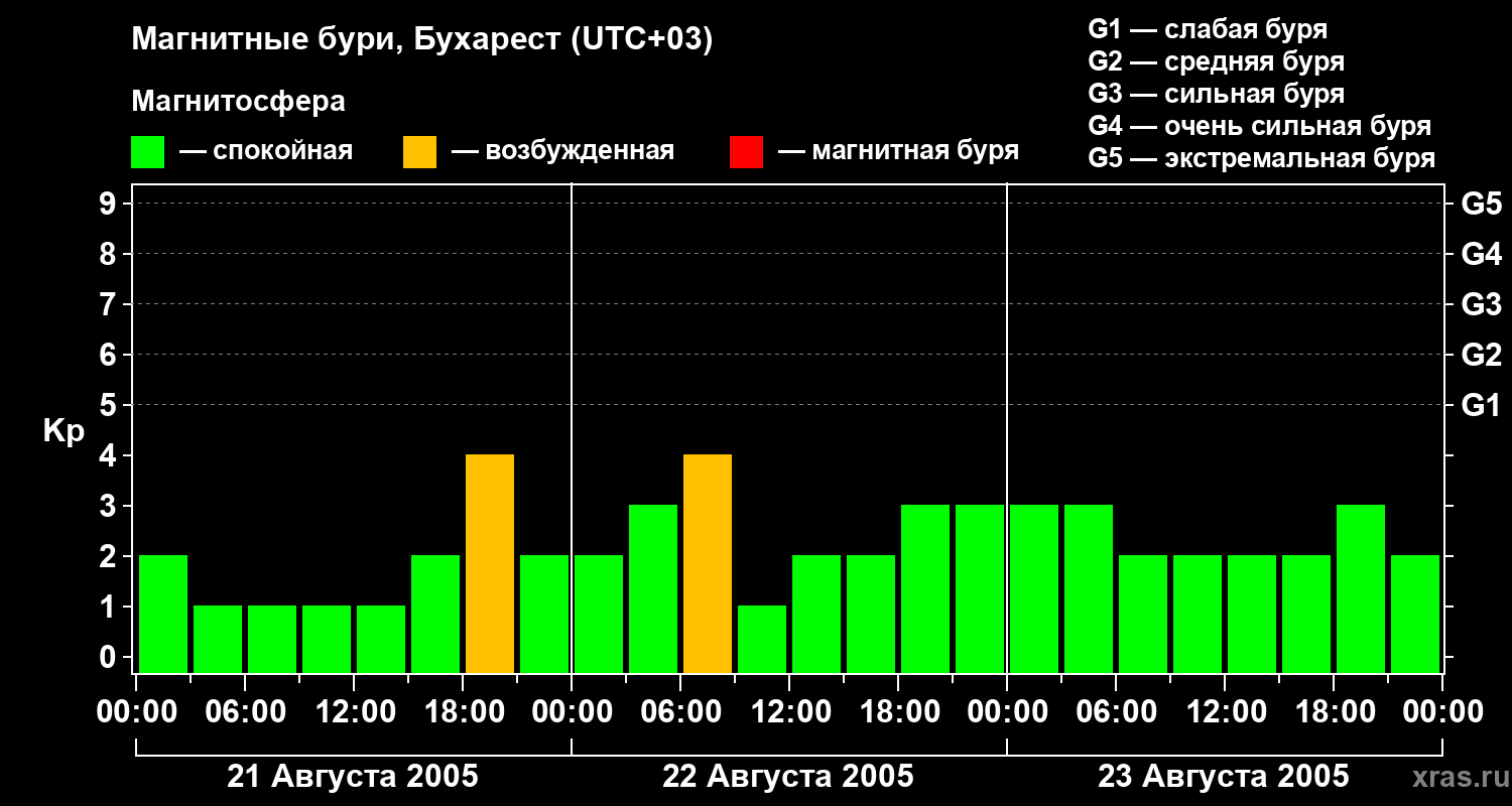 Изменения геомагнитного индекса Kp с 21 по 23 августа 2005 года для средних широт