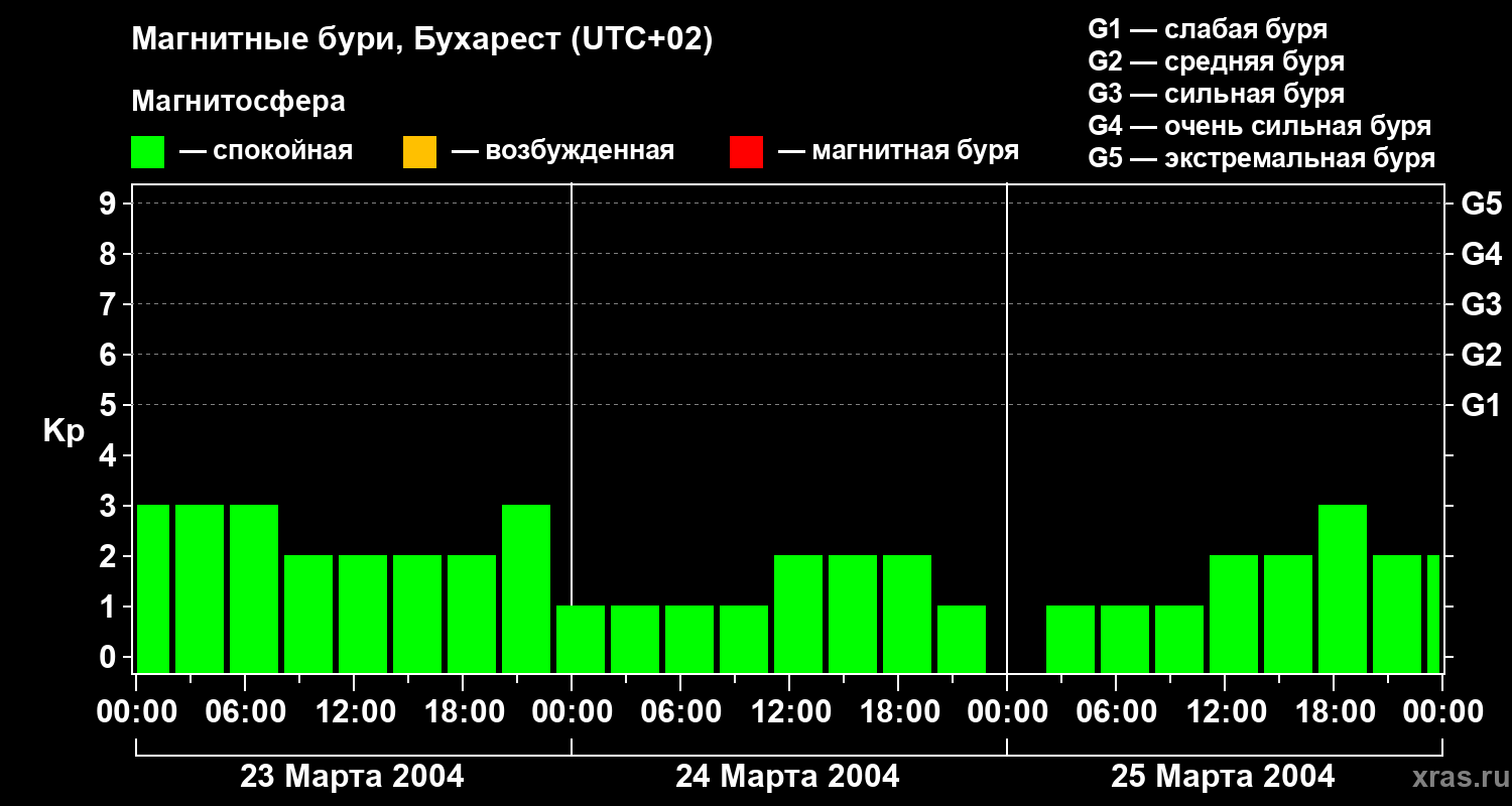 Изменения геомагнитного индекса Kp с 23 по 25 марта 2004 года для средних широт