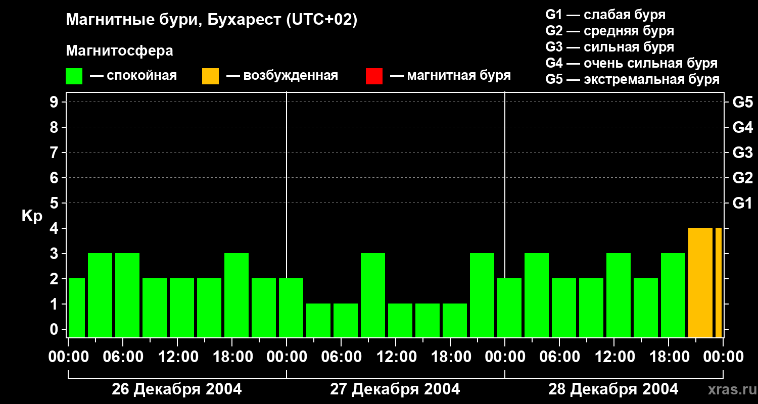 Изменения геомагнитного индекса Kp с 26 по 28 декабря 2004 года для средних широт