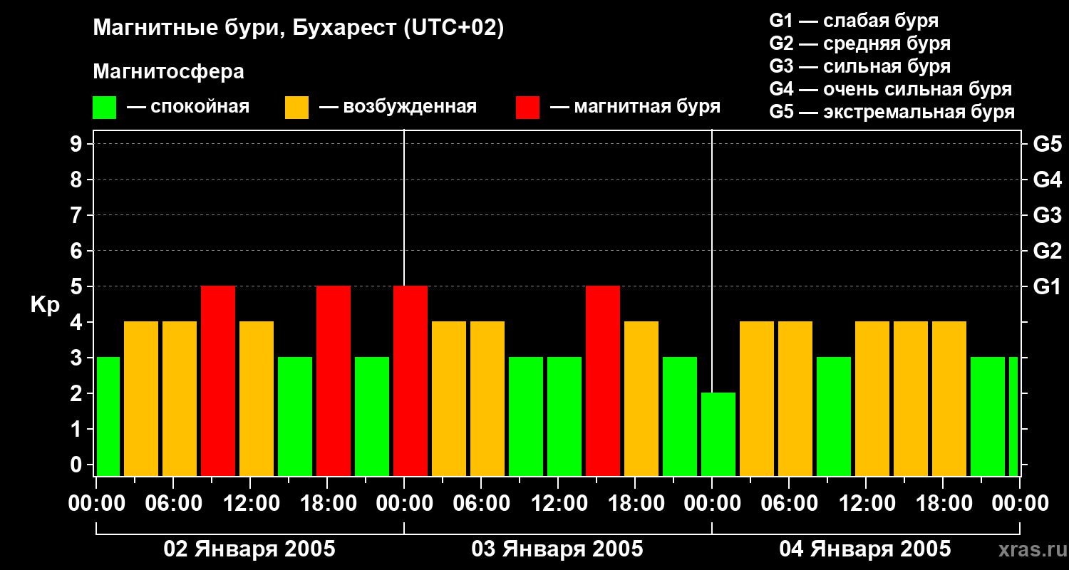 Изменения геомагнитного индекса Kp с 2 по 4 января 2005 года для средних широт