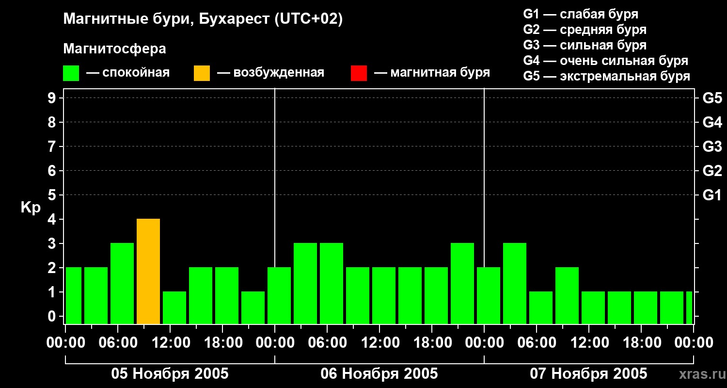 Изменения геомагнитного индекса Kp с 5 по 7 ноября 2005 года для средних широт
